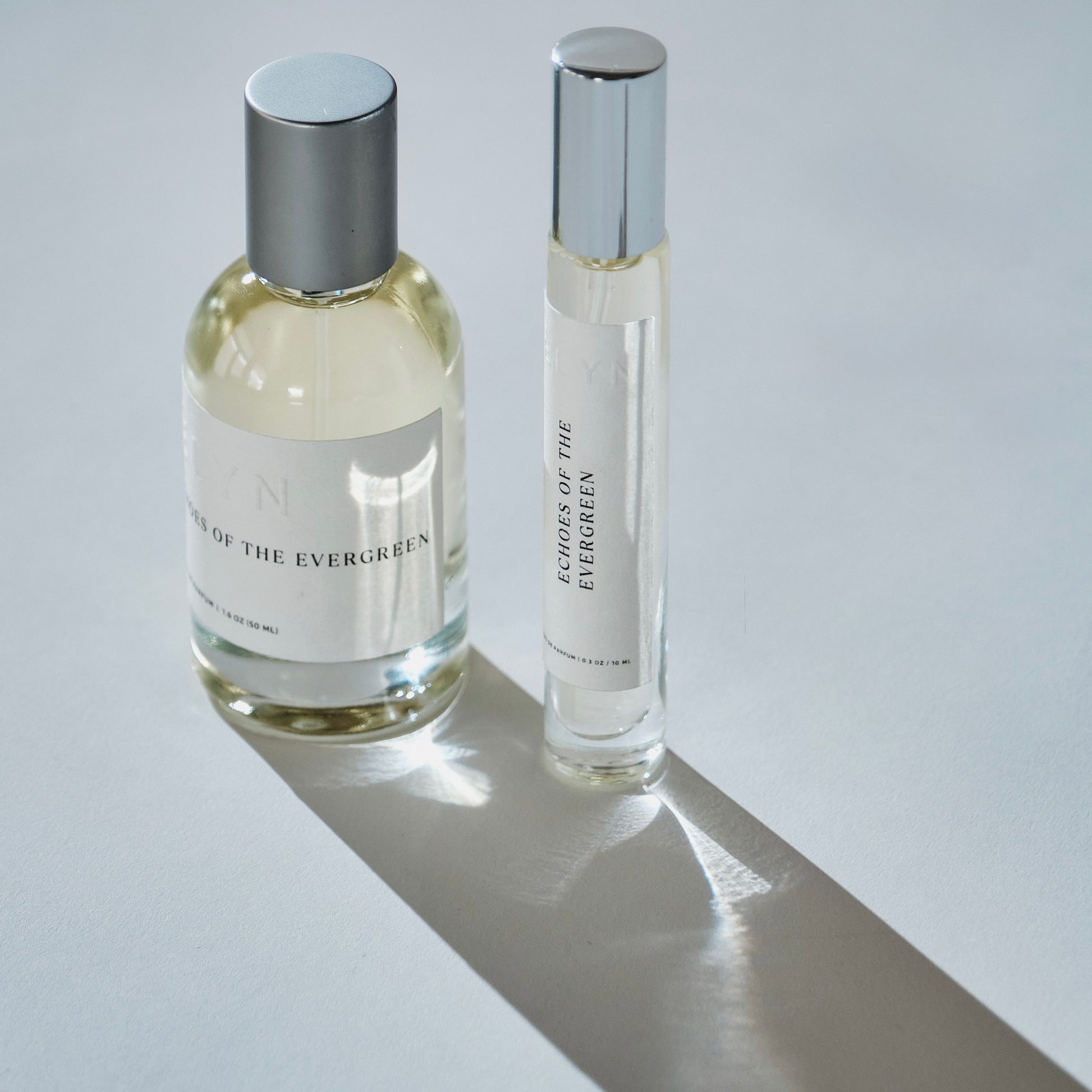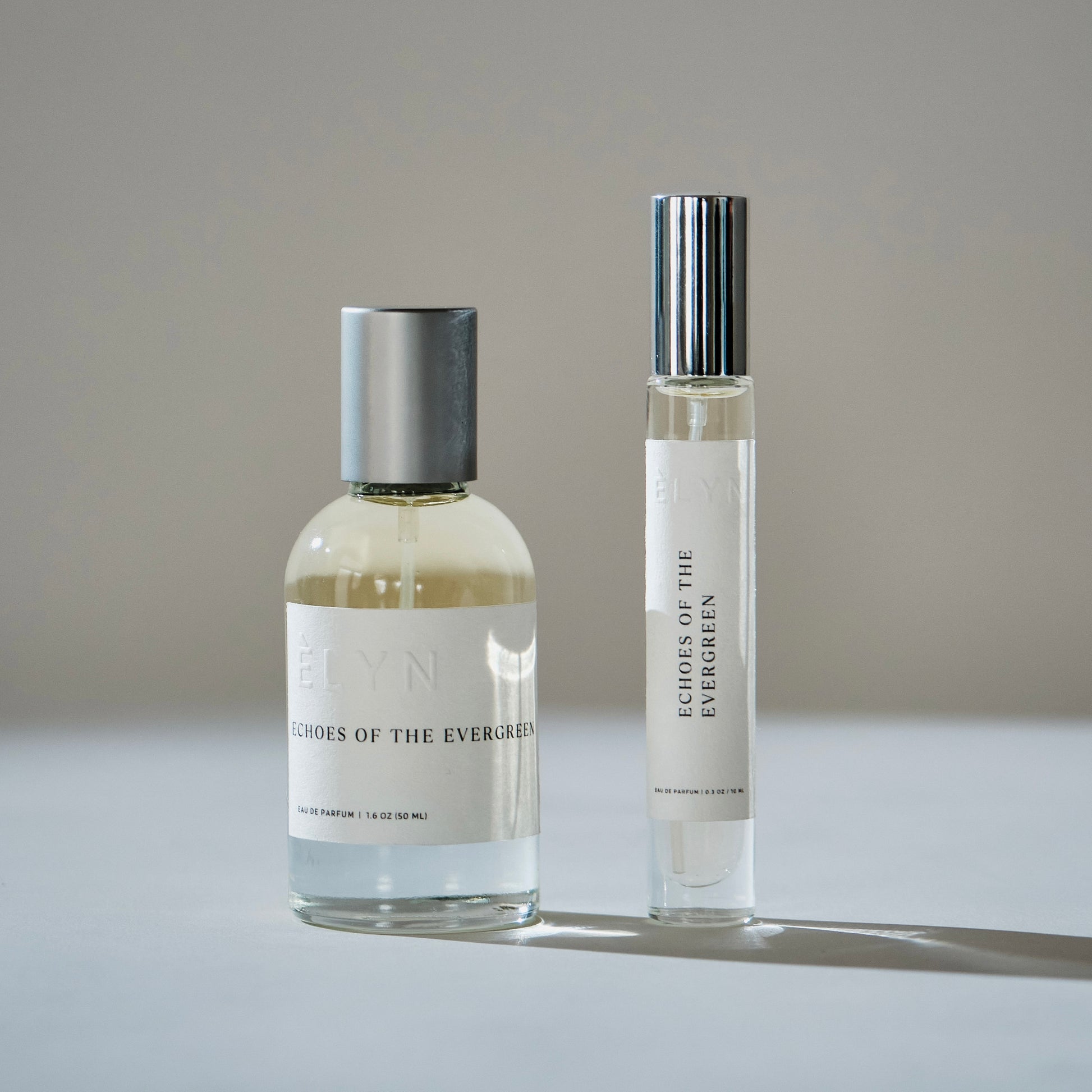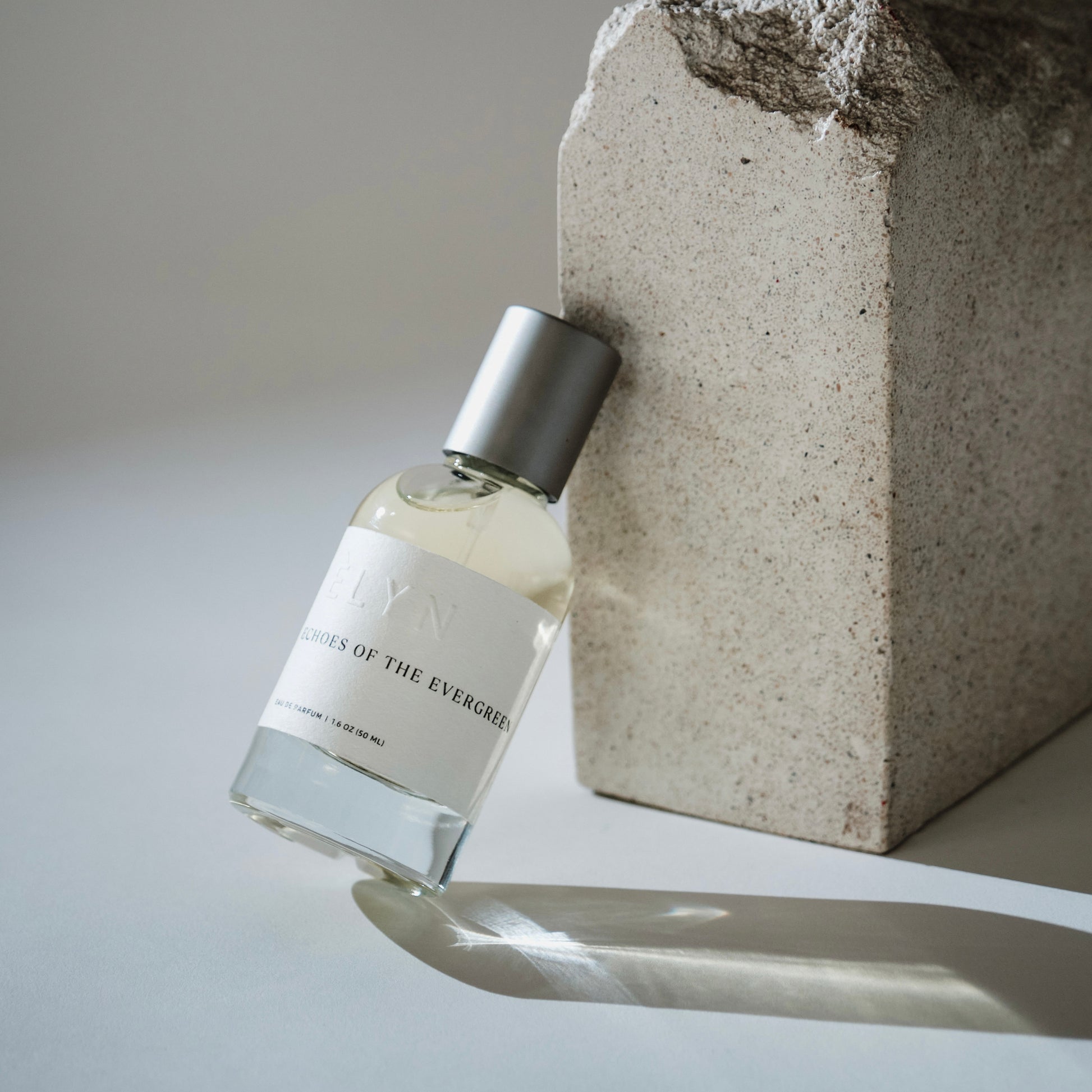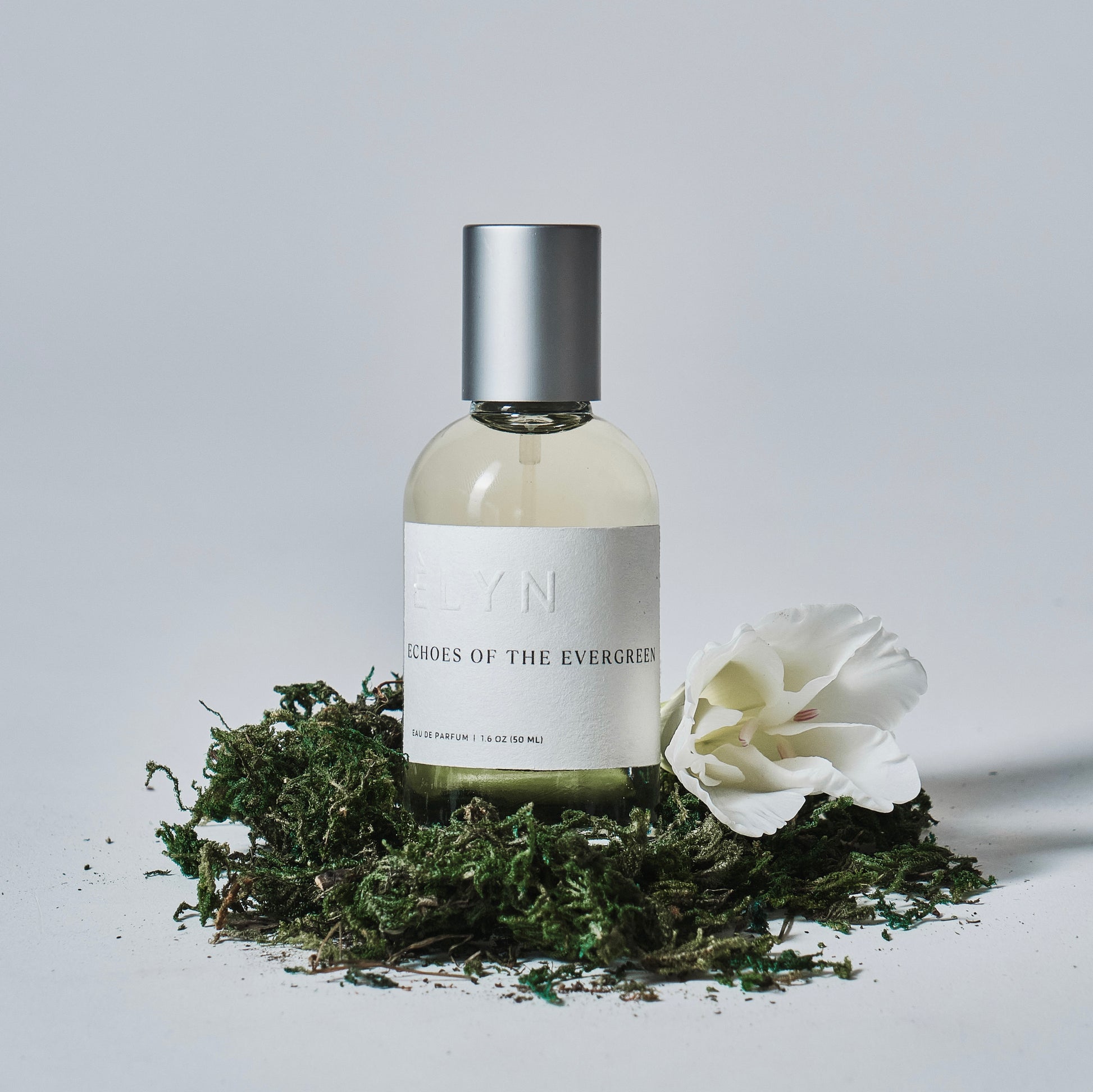 Echoes of the Evergreen- a crisp green opening of grass and citrus eases into delicate lily of the valley and ripe fig. Soft wood grounds the scent, with sandalwood and oakmoss leaving a clean, earthy trace, like breath meeting still forest air.